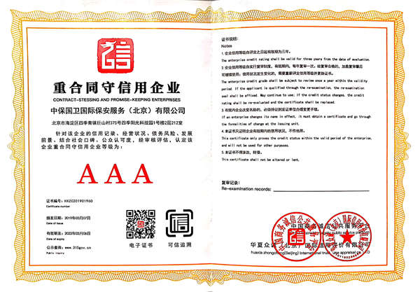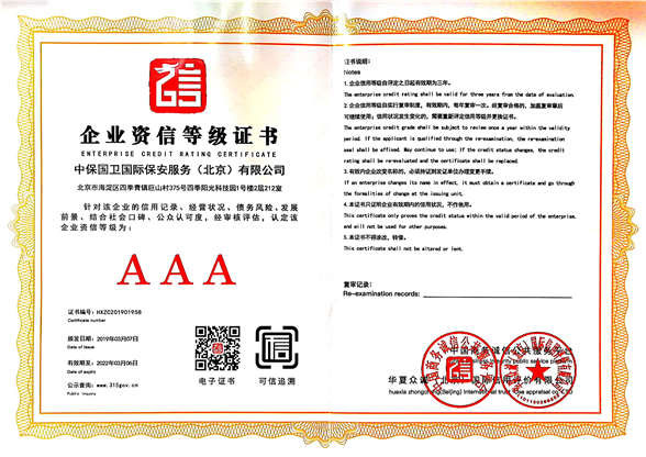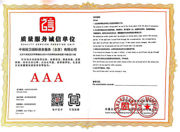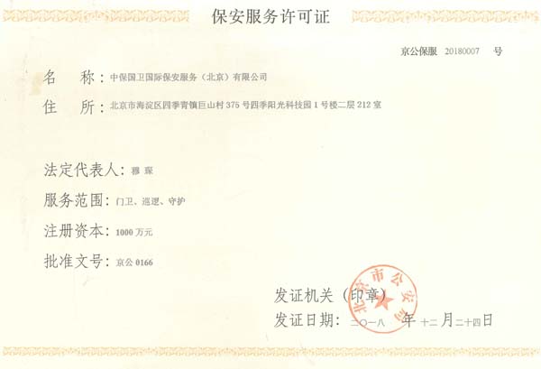 中保國衛(wèi)國際保安服務(北京)有限公司,屬中保國衛(wèi)集團旗下子公司。能全方位的為大型客戶提供優(yōu)質的安保、押運服務,是集人防和技防于一體的新型正規(guī)化綜合安保押運服務企業,提供人防、物防、技防、聯網報*、非武裝押運等安防相關的一站式服務。 公司在國內多省設立有分公司及分支機構,著重提升安全押運、智能技術押運及安全技術防范相關的服務,業務范圍覆蓋全國一、二線城市、港澳地區以及海外地區。安保方面主要為政府機構、金融機構、企事業單位、醫療衛(wèi)生、高等院校、工業園區、大型商場、高檔住宅、智能商務樓、大型活動提供門衛(wèi)、守護、巡邏、押運(非武裝)、安全檢查、保安特勤、私人護衛(wèi)、消防中控、安全技術防范、遠洋護航等全方位服務,同時面向國際市場,為中資企業在“一帶一路”沿線國家投資提供境外安保服務。 >> 更多內容 |